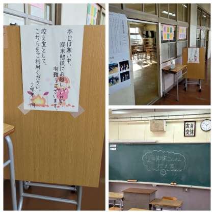 期末懇談、ありがとうございます。とても寒いですので、各学年に控室を用意しています。写真は2年生の控室です。