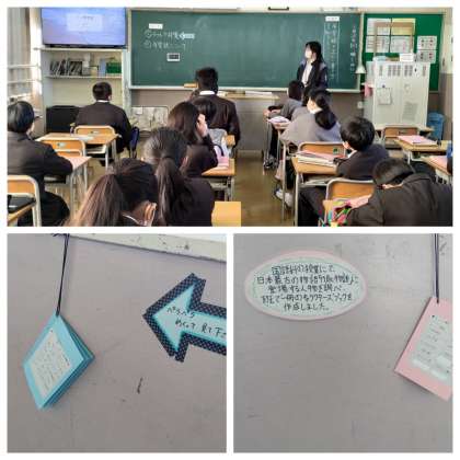 2枚目の国語の様子の下の写真は、国語の授業で取り組んだものを廊下に掲示していたので撮影しました。