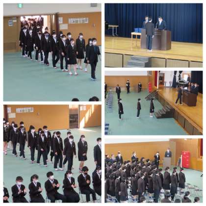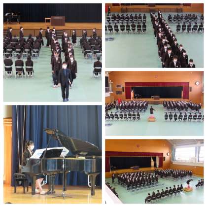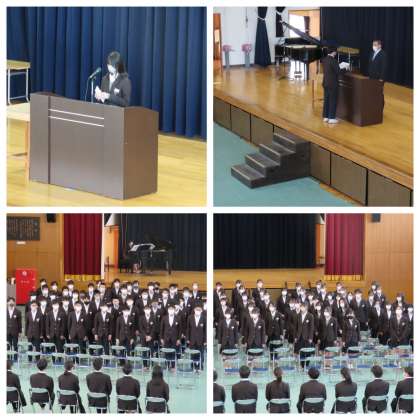 卒業式予行の様子です。当日は、1年生、2年生の代表生徒も参列しますので、卒業生と一緒に予行に参加しています。