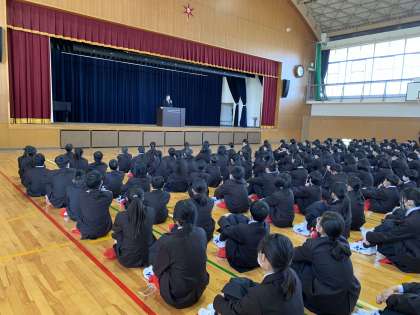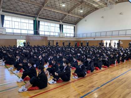 先日入学式を終えた1年生、それぞれ進級し新しいクラスで整列した2,3年生が体育館に揃いました。