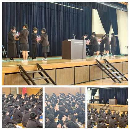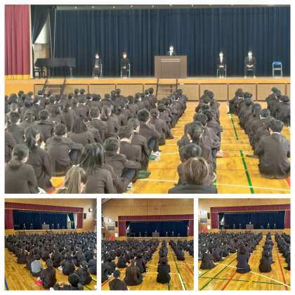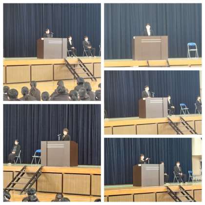 6時間目、昨年度末で本校を去られた先生方をお迎えして離任式を行いました。おひとりおひとりが生徒たちに心のこもったメッセージを残して下さいました。ありがとうございました。生徒たちもしっかり傾聴できていました。