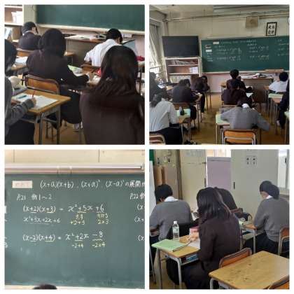 3年生の数学です。分割による授業も始まりました。数式の展開のプリントをしています。先生から、残りの時間、自分でやりきろうと声がかかり、一人ひとりプリントに取り組みだしました。ここで本気になって問題に向き合うことが大事です。