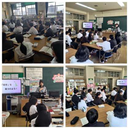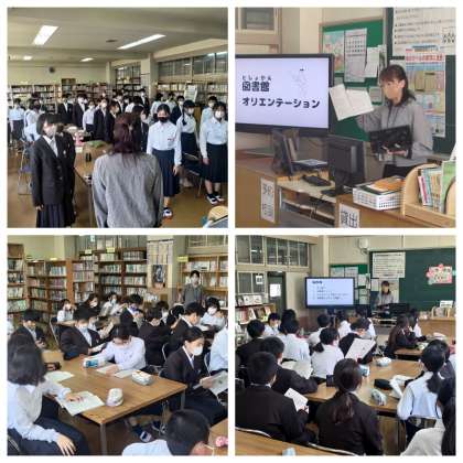 1年生の各クラスに対して今日と明日の2日で図書館のオリエンテーションを行います。学校司書の先生が説明します。みんなの図書館、マナーを守って楽しい空間にしていきましょう。