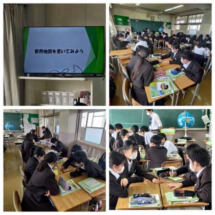 1年生の社会です。世界地図を書いてみようと言う事で班で話し合っています。世界ってどんな形だったかなぁ、正確な形を思い出しています。