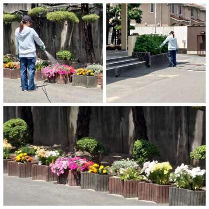 玄関の花壇の花に水のプレゼントです。