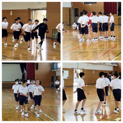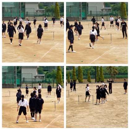 男子は体育館で集団行動、女子はグランドでハードル走です。