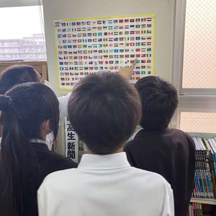 今日は、図書館内の掲示物「国旗」で楽しむ姿が見れました。
