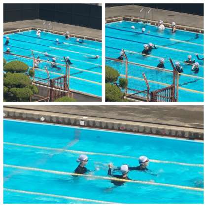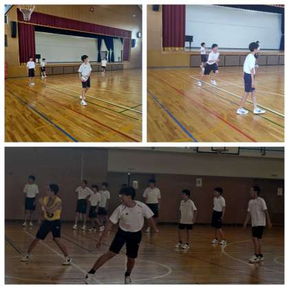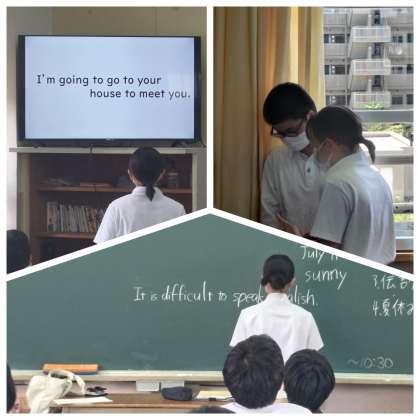 2年生です。1組、2組は体育、男子は体育館、女子はプールです。3組は英語でした。英文の伝言ゲームの様子です。不定詞を使った英文を暗記して伝言していき、最後の生徒が黒板に英文を書きます。
