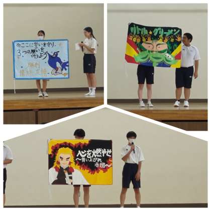 今日は体育館での練習となりました。青、緑、赤の3つの団の団長の挨拶や開閉会式での礼の練習などに取り組んでくれました。