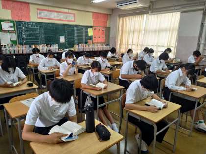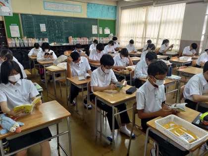 昨日はPTAの会議があったのですが、2年生の委員会の報告の中で、チャイム着席が良くできていると学年の先生から話がありましたと学年委員の保護者の方の報告がありました。2年生のフロアに行ってその事を伝えたら、こちらもニコッとして拍手していました。「ところで、朝の読書の時間まで後一分くらいなんだけど」と話すと、一斉に自席に向かいました。写真は2年生の様子です。