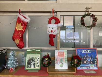 図書館にクリスマスリースを作ってくれた1年生がいました。