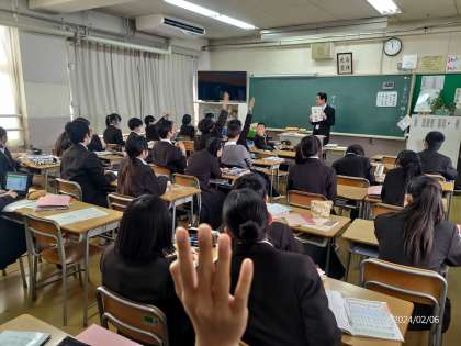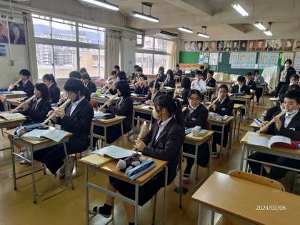 国語、音楽の授業です。国語は質問に答えようと手を上げているところ、音楽は演奏にあわせて順番にリコーダーを吹いている場面です
