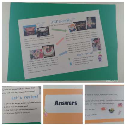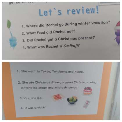 写真はAETの先生が掲示されたものです。冬休みの思い出が綴られています。最後に何が書かれていたか質問かついていて、答えも見ることができます。