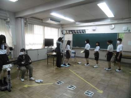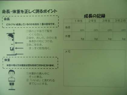 これから学校で行われる様々な検診の中で、今日は全学年で発育測定を行っています。身長と体重の2計測を行いました。生徒一人ひとりに「成長記録」という黄色のカードを配付しています。47期生はとても静かに発育測定を受けることができていました。