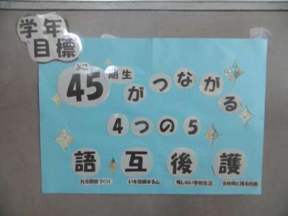2階廊下に飾られている掲示物です。学年目標の「45期生がつながる4つの5! 語互後護」