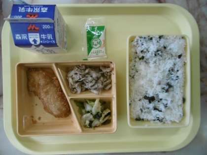 今日のメニューは、わかめごはん、白身魚フライ、タルタルソース、豚肉のしょうが炒め、白菜のおかか、牛乳です。