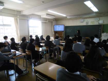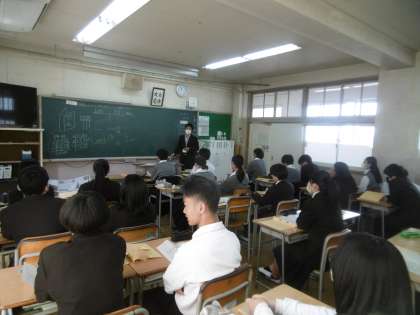 写真は上から、3年2組(社会)、3年3組(国語)です。両クラスとも、授業の進め方や評価のつけ方、テストの予定など、教科担当の先生から説明がありました。