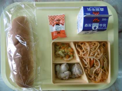 今日のメニューは、コッペパン、スパゲティナポリタン、鶏肉の香草焼き、野菜炒め、ミルクバター、牛乳です。