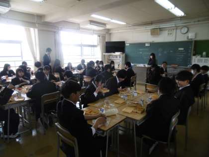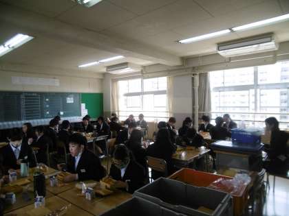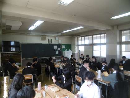 写真は上から、1年1組、1年2組、1年3組です。やはり、生徒にとって給食の時間は楽しいようです。みんなが笑顔でした。教室には副担任の先生も一緒に入り、二人で給食指導を行っています。