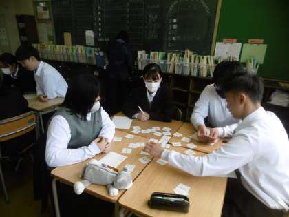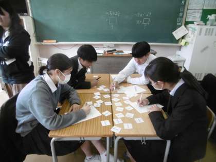 学習カードを使い、班ごとに協力しながら問題を解いていました。学習カードには、今まで習った文字式、一次方程式、連立方程式などの単元名が書かれていて、どの単元の問題を解くかを生徒自身が判断し、カードの裏面に書かれた問題を解き、班員に解き方を説明するという授業内容でした。