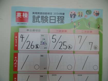 英語実用検定の申し込みは4月26日(金)までです。受験を希望する人は、申し込み用紙と受験料を添えて、各学年の英語科の先生へ申し込んでください。一次試験は5月25日(土)、二次試験は7月7日(日)になります。