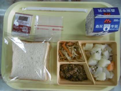 今日のメニューは、食パン、洋風含め煮、ミートサンド、もやしのカレー和え、スライスチーズ、ミルメーク、牛乳です。