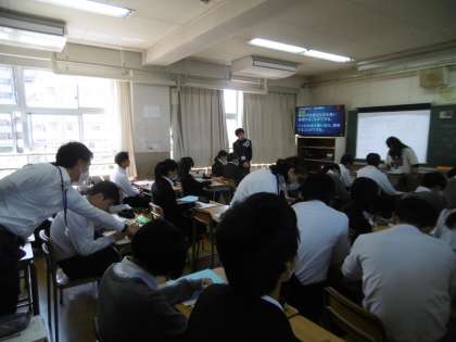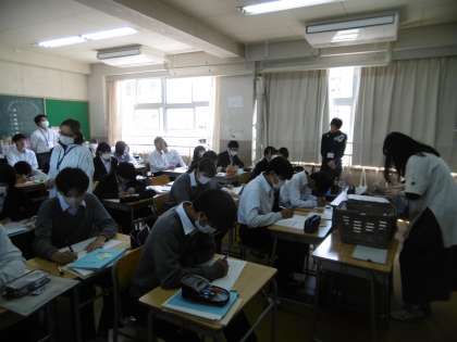 学習内容は「乗法公式」でした。教室に数学の教員が3名、学校サポーター(授業支援員)1名の4名体制で授業が行われていました。質問しやすい環境に生徒も喜んでいました。