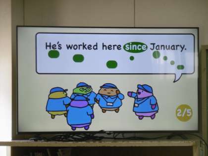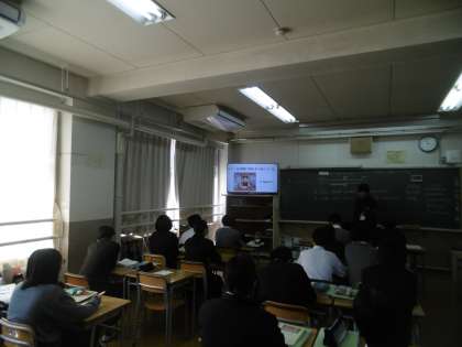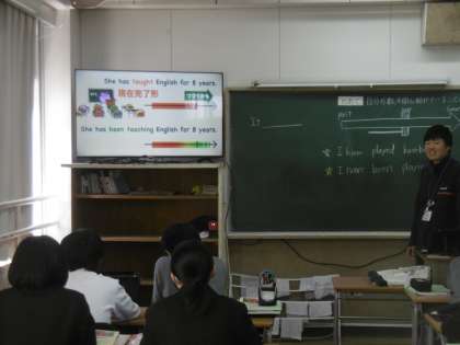 分かりやすいパワーポイント(映像)を使って授業が進められていました。リズム感のある授業に、生徒もテンポよく教科担当の先生の質問に答えていました。