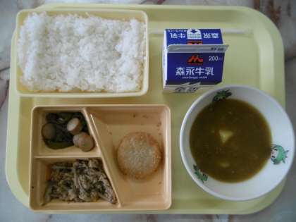今日のメニューは、白ごはん、コーンコロッケ、ごぼうサラダ、ソーセージとピーマンの炒め物、カレーシチュー、牛乳です。
