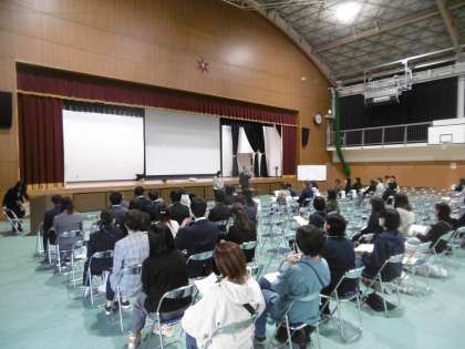 学習参観後にPTA総会、教育課程説明会、学年懇談会が行われました。学年懇談会では、修学旅行説明会(3年)、宿泊学習説明会(2年)、校外学習説明会(1年)を行いました。写真は上から、PTA総会、修学旅行説明会、宿泊学習説明会の様子です。