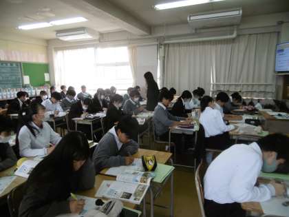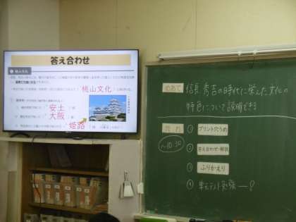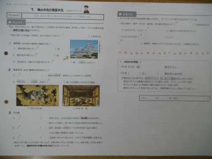 授業のめあては「信長、秀吉の時代に栄えた文化の特徴について説明できる」でした。とても丁寧に作られた学習プリントが印象的でした。今日も子どもたちは静かに授業を受けることができていました。