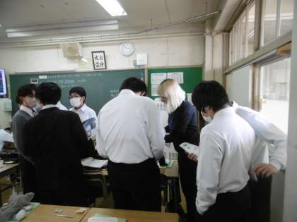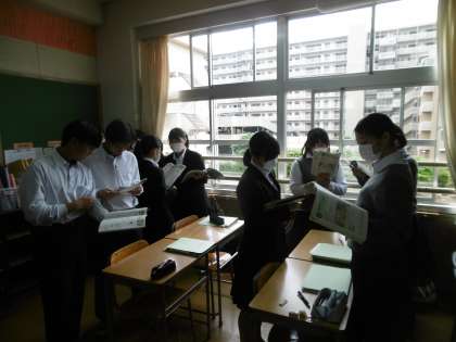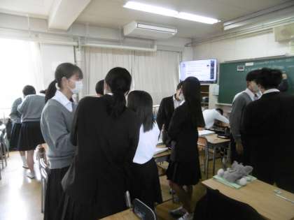 元気よく、どの生徒も大変意欲的にペア学習を行っていました。先生から出された課題に対して、ペアになって英語で答えていました。AET(英語実習助手)も生徒のグループに積極的に入り、英語で答えていました。