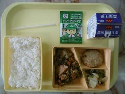 今日のメニューは、白ごはん、厚揚げの五目炒め煮、キャベツ入つくね揚げ、かつお和え、ふりかけ、牛乳です。