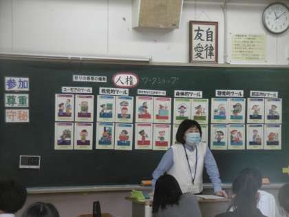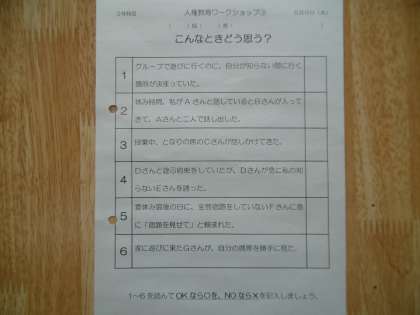 本校のスクールカウンセラーが講師となり、2年生の全学級で「怒りの感情〜気持ちを落ち着かせる方法〜」について、講義していただきました。気持ちを落ち着かせる6つの方法について、ワークシートをもとにクラスの全員が参加し、自分なりの方法について考えました。人それぞれが感じ方の違う「心の境界線」についてもみんなで意見を出し合い、人によって許せる範囲が違うことも学びました。「心の境界線」を考える6つの質問は以下のとおりです。