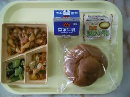 今日のメニューは、ハニーバンズ、チリコンカーン、ささみとピーマン炒め、小松菜としめじの炒め物、豆腐プリンタルト、牛乳です。