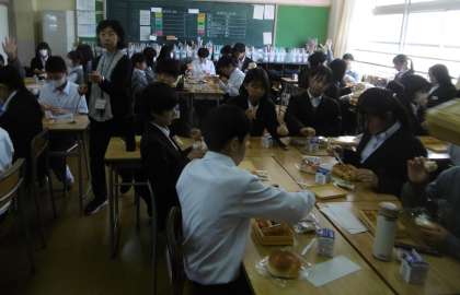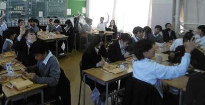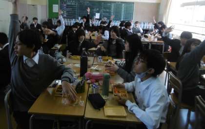 写真は上から、2年1組、2年2組、2年3組です。全クラスで余った給食を分けるためのじゃんけん大会が行われていました。やはり、給食の時間は子どもたちの表情も実にいいですね。