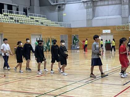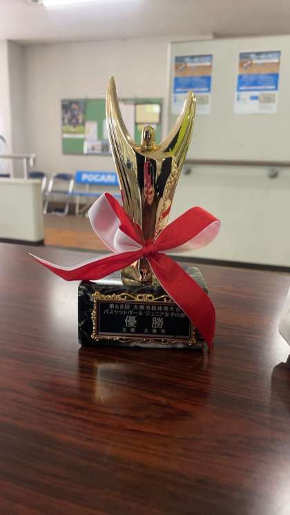 今日は市民大会の開会式が行われました。昨年度優勝校の女子バスケットボール部に優勝トロフィーの返還が行われました。トロフィーがレプリカになって帰ってきました。