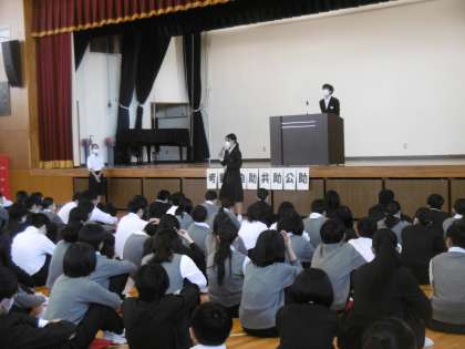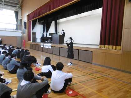 生徒会長からは、今後設置される「あったかBOX」について、話がありました。うれしいエピソードや自分が温かいと感じた行動などを紙に書いて箱に入れてほしいとのことでした。315名の全校生徒でたくさんのあったかエピソードを集めましょう。今日は代表生徒2名のあったかエピソードの紹介がありました。