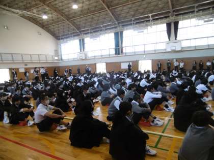 校長からは、先週行われた避難訓練及び引き渡し訓練の振り返りとして、命を守る行動の「自助・共助・公助」の言葉を紹介し、自助(自分が助かる)、共助(共に助かる)の行動で70%を占めるということについて、生徒に話しました。