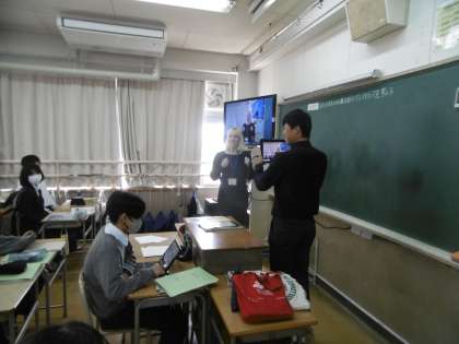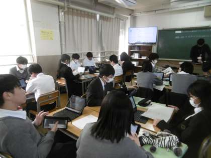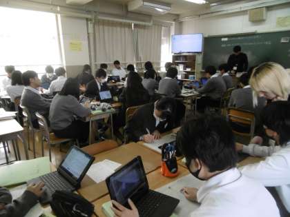 授業のめあては「自分の好きな曲について英語で説明し、その様子をタブレットパソコンを使って、動画に撮ることができる」でした。生徒一人ひとりが生き生きと授業を受け、難易度の高い課題に向かって、解決しようとする一生懸命な態度にとても感心しました。教科担当の先生とAET(英語実数助手)との連携の取れたコミュニケーションは、今日も抜群でした。