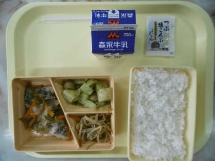 今日のメニューは、白ごはん、白身魚のマリネ、じゃがいもとソーセージのバジル炒め、もやしのカレー和え、塩こんぶ、牛乳です。