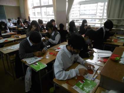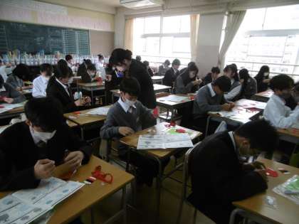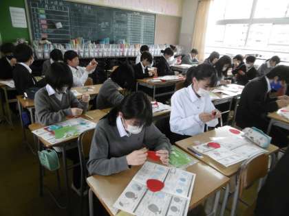 玉止め、玉結び、並縫いの実習でした。悪戦苦闘しながらも、子どもたちは一生懸命に果物の作品作りをしていました。針に糸を通し、玉止めや玉結びを使って裁縫を経験したことは、これからの生徒の人生にいつか必ず役立つことでしょう。