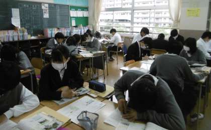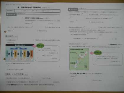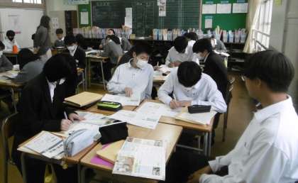 授業のめあては「日本国憲法の三大基本原理について、理解することができる」でした。とてもきれいに作られた学習プリントをもとに、4人班を活用していました。本校では「学び合い・高め合い・認め合い」をとても大切にしています。