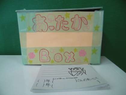 生徒会役員がすべての教室に「あったかBOX」を設置してくれました。各個人が「あったかエピソード」を用紙に記入し、その内容が生徒会通信に記載されるという取り組みです。皆さんの応募を生徒会は待っています。
