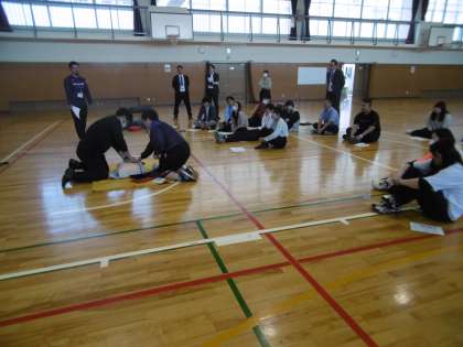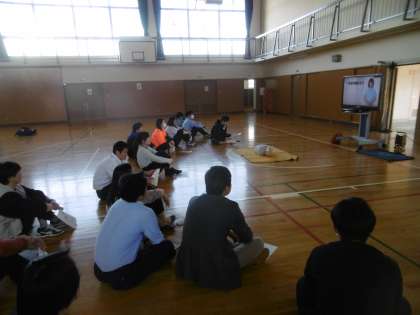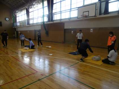 生徒下校後、16時より「職員研修(救急救命)」を体育館で行いました。AED(訓練用)と人形を使って、実際に人工呼吸(胸骨圧迫)の練習を全教員で行いました。救急救命の資格を持った先生を講師として、DVD(映像)とプリントを使いながらの研修となりました。これからも安心で安全な学校づくりに努めていきたいと思います。