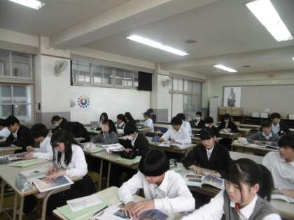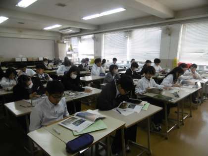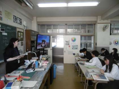 学習内容は「絵から物語をつむぐ」でした。大型テレビに映し出された様々な作品について、学習プリントを使って、教科担当の先生が説明を加えていました。