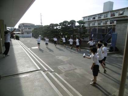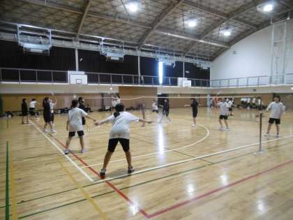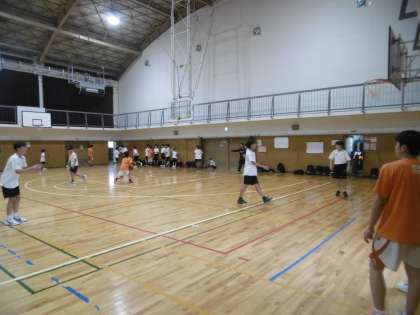 写真は上から、バドミントン部、男子バスケットボール部です。キャプテンを中心に一生懸命に練習をしていました。