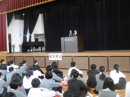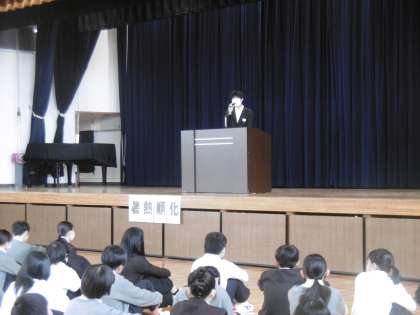 校長からは、これから気温が上がり、熱中症が心配されることから、「暑熱順化(暑さに体が慣れること)」について、生徒に話をしました。また、今日から始まる教育実習に向けて、実習生(本校の卒業生)からあいさつをしてもらいました。