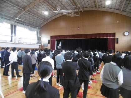 生徒会長からは、前期生徒会スローガン(♯まきこめ谷中315)の達成に向けて、朝のあいさつを大事にしてほしいという話がありました。今日も時間どおりに全校生徒が集合し、全校集会が開始されていました。