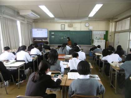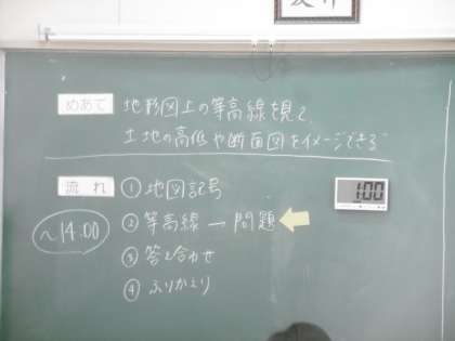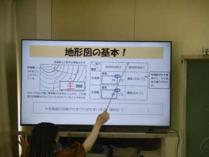 授業のめあては「地形図上の等高線を見て、土地の高低や断面図をイメージできる」でした。丁寧に作られた学習プリントと説明用のパワーポイントで、イメージをつかむことができたでしょうか。